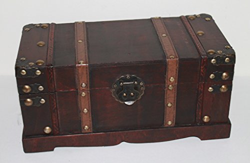 Schöne edle Truhe aus Holz. Außen mit Kunstlederriemen versehen, Metallkanten schützen die Ecken. Die Box ist zum Aufbewahren Verstauen und Verschenken bestens geeignet. Vielseitig einsetzbar in Wohnung und Haushalt. Als Hochzeitsgeschenk gefüllt mit Geld oder als Box für eine edle Flasche Wein prima zu verwenden. Auch CD´s passen längs und quer hinein (ca. 25 Stück).